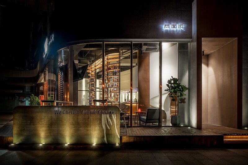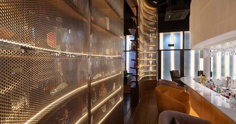 由于面積局限,將落體玻璃設計成高5米的戶型酒架,不但界定出來酒吧的前后場地區域,還充當儲物展示作用,最大限度地提升空間使用率,穿孔不銹鋼鏡面提高了空間通透感。在這里,你可以盡情的釋放自我,打開內心的藩籬、摘掉日常的面具,“移步換景”后,興許你還能碰到另一個久違的自己。