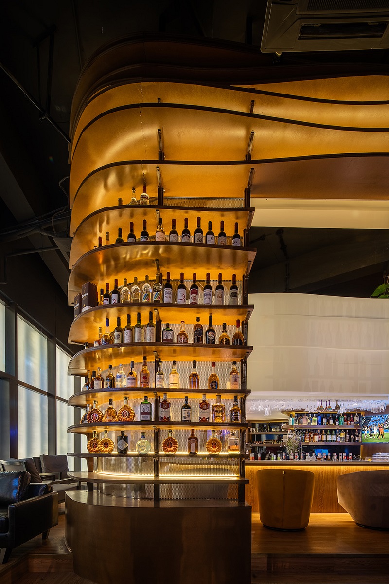 設計技巧:運用豐富的視覺感官創造動靜相宜的酒吧空間,以吧臺為核心和原點,刻意抬高的組合設計將空間分割成不同的功能區域。利用原建筑層高的優勢,通過具有雕塑感的雙螺旋樓梯作為上下連接紐帶,在吧臺上方設置了私密夾層。